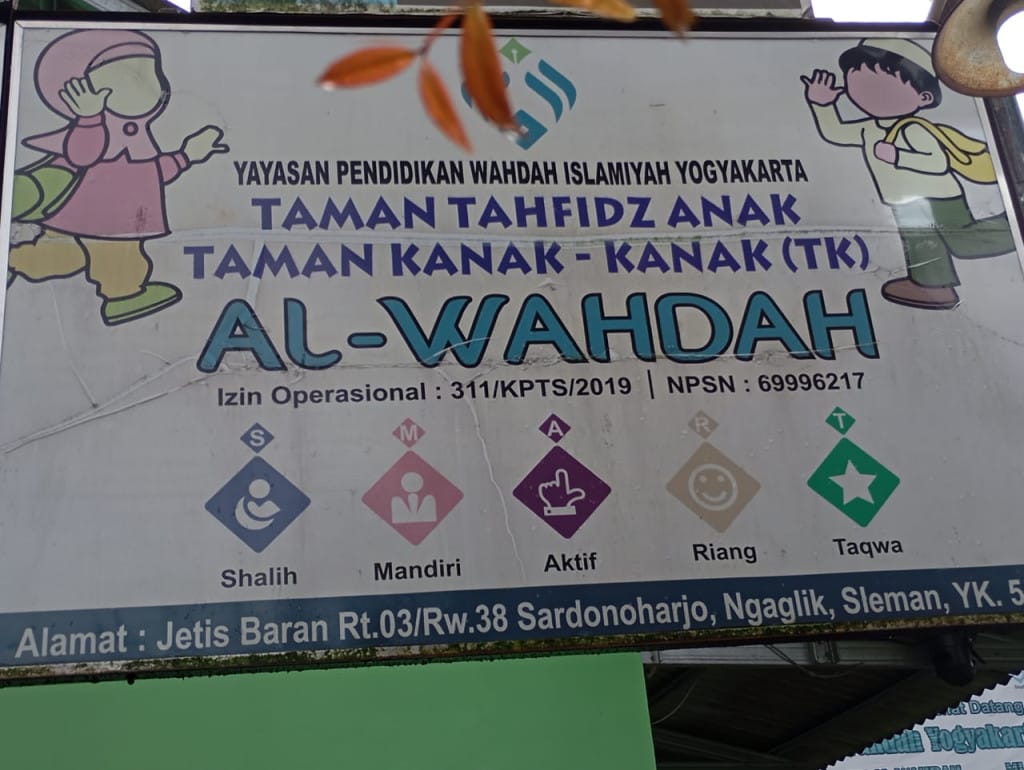 Alamat TK Al Wahdah : Jl.Kaliurang KM.10, Jetis Baran Rt 03 Rw 38, Sardonoharjo, Ngaglik, Sleman, DIYogyakarta 55581.