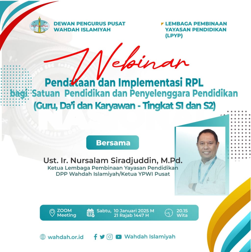 MAKASSAR WAHDAHEDUMAGZ.COM — Ketua Lembaga Pembinaan Yayasan Pendidikan (LPYP) DPP Wahdah Islamiyah, ustadz Nursalam Siradjuddin, memaparkan ketentuan dan mekanisme administrasi Program Rekognisi Pembelajaran Lampau (RPL) dalam webinar sosialisasi kerja sama Universitas Islam Sultan Agung (Unissula) Semarang dengan Wahdah Islamiyah, yang diselenggarakan secara daring melalui Zoom, Jumat (10/1/2026).